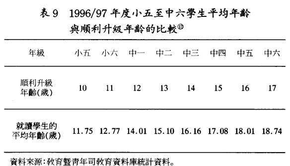1996/97年度一項關於學生順利升級的年齡統計,發現平均年齡普遍超齡1-2年,例如小五學生正常年齡應是10歲,但升級的學童平均年齡爲11.75歲,中三學生正常年齡爲14歲,但平均升級年齡爲16.16歲。這一統計又從另一角度證明留級延誤了人才成長周期。