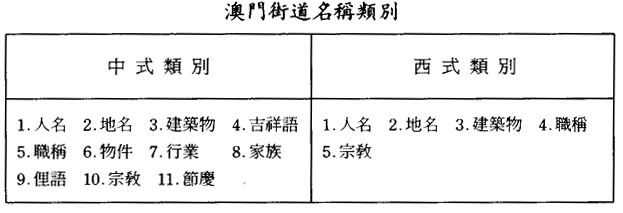 若從文化的大類看,澳門街道的名稱明顯地分爲與中式(東方文化)和西式(西方文化)兩大類型。我們可以按街名的涵義,將其列表如下: