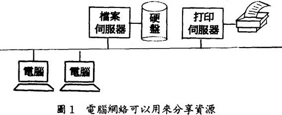 澳門大學早在1988年,已開始籌劃建立電腦網絡系統。當時大部份的電腦都集中在電腦實驗室,而我們最主要的目的,是希望藉着網絡的連繫,分享一些昂貴的電腦資源。比如說,當時的硬盤和打印機都是比較貴重的配件,若果每一部電腦都配備的話,不合乎經濟效益。但通過網絡,每一部電腦都可以分享在網絡伺服器上的硬盤和打印機(圖1)。同時,電腦網絡亦提供了管理上的方便,例如軟件可以祇安裝在檔案伺服器上而不必安裝到每一部電腦。我們亦可以通過控制用戶的戶口,防止非法使用者濫用實驗室的設施。