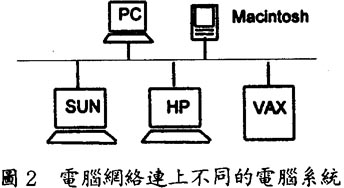另一方面,澳門大學擁有各式各樣的電腦系統。由個人電腦(PC)、蘋果(Apple Macintosh)電腦、惠普(HP)工作站、SUN工作站以至DiglVAX中型電腦系統等,各有不同的功能。如果將這些系統連在一起,老師和同學便可以更方便地使用(圖2)。例如我們可以利用IBMPC去遙遠進入(remote login)Digital VAX的系統,也可以在兩個不同的電腦系統之間交換檔案、電子郵件等。這樣旣增強了各個系統之間使用的靈活性,亦爲“電腦網絡”和“通訊”的敎學上提供了實驗的設備。