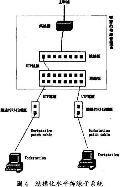 我們決定採用結構化佈線系統,並必須符合國際辦公室EIA/TIA568的標準。在校園七座建築物內,規定安裝共約500 個五級RJ45插座——雖然那時我們祇有約200部PC。分佈於各房間的插座,通過UTP電纜,連接在樓層的跳線板(Patch Panel)和集線器(hub)上。而這些集線器會再連上校園網絡的主幹線。結構化佈線系統的好處在於便於管理、維修以及具有擴展的靈活性。我們在每一間辦公室和課室,根據面積的大小和用途,都預留了一至數個RJ插座。將來新加的電腦,祇要接上這些插座,再在樓層的跳線板調整一下,便可以將電腦上網(圖4)。這樣旣方便快捷,安裝時亦不影響網絡的運行。相對的舊式網絡設計,每加一部電腦都要對佈線系統作出改動,而這些改動可能會影響整個網絡的服務。