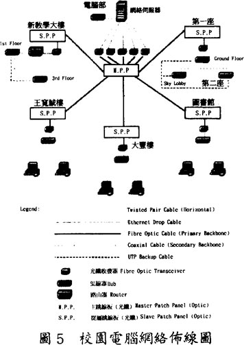 從我們收到的建議書中,各電腦供應商的建議不一,在佈線系統的主幹線(Backbone)上,有的建議用光纖(fibre optics),有的建議用同軸電纜(Coaxial Cable)。在建築物內的水平佈線子系統(Horizontal Cabling Subsystem),有的提議用結構化佈線系統(Structured Cabling System),有的不是;有的提議採用五級(Category 5)非屏蔽雙絞軟線(UTP:Unshielded T wisted Pair),有的祇建議用四級、甚至三級的UTP。而在這時候,建築群網絡(Campus Network)和結構化佈線系統也剛在香港興起,在參予了有關的硏討會,經過一番硏究,以及和香港其他大學交流後,我們決定了下列的標準要求: