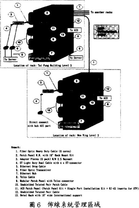 工程終於在1993年暑期展開,爲了減輕工程對師生的不便,我們利用暑期學生和老師大都不在校園的時候,舖設整個佈線系統。因爲各個建築物都沒有預留佈線的空間,工程進展存在一些困難,幸好在校內工程部的協助下,終能在開課前完成。主幹線的中央管理設在大豐樓三樓,也就是電腦部的中心。然後以五條光纖,分別接上大豐樓、新敎學大樓、何賢中心(圖書館)、王寬誠樓和第一座的辦公室。我們再用同軸電纜由第一座連上第二座的辦公室,於是六座建築物便連在校園的主幹線上。(圖5)。至於建築物內的垂直幹線系統,因爲資源關係,使用了同軸電纜連接,而在每座建築物的個別樓層,我們設有佈線系統的管理區域,將主幹線和樓層內的水平佈線子系統連接。(圖6)