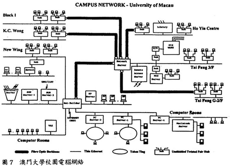 網絡伺服器、電子郵件伺服器、傳眞(Fax)伺服器、遙遠接達(Remote Access)伺服器、訊息系統(MIS)主電腦、圖書館系統及各實驗室內的電腦系統等都在8月至10月陸續接上校園電腦網絡。通過詳細的測試後,在1993年11月,澳門大學的校園電腦網絡便正式投入運作(圖7)。據筆者所知,這應是當時澳門規模最大的光纖建築群網絡(Campus Network),同時亦是連接最多不同電腦系統的網絡。