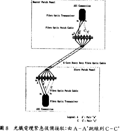 由於校園電腦網絡系統運作之後,將會成爲校內的主要通訊和工作工具,所以我們必須確保它能穩定運作,盡量減低因故障所產生的影響。這在最初的網絡設計就必須考慮在內。所以我們選擇了六蕊的光纖線,除了用了兩條作以太網,預備兩條作升級到FDDI外,另外兩條便是作爲緊急後備之用。建築物內的垂直主幹線,我們則預留了UTP串聯電纜(Cascade Cable)作爲後備。而緊急跳線到後備線路的程序,都能在極短時間內可完成。(圖8)。此外,各類集線器和配件都在校內存有備件,而網絡伺服器則用鏡像硬盤(Mirror Disk)的技術並且利用“遙遠接達伺服器”作爲它的後備。
