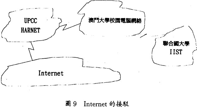雖然所費不菲,但校方覺得Internet對敎學及科硏發展極其重要,而且大學也有責任將這先進科技引進澳門,於是指示電腦部積極進行。我們利用一部網絡路由器(Router)與香港大學電腦中心相應的路由器以19.2K的專線接駁,從而成爲我們大學校園電腦網絡接上Internet的網絡連接器(Gateway)。另一方面,我們使用一部SUN工作站與UNU/IIST以14.4Kbps撥號連接方式連上。(圖9)