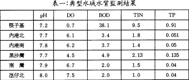這種淺層封閉水域,潮汐影響小,溶解氧傳輸迅速有利於穴居底棲生物繁殖。然而,由於污染已使水生生態環境遭到破壞,特別在中國與澳門交界處已成爲死水域,底質呈黑色,溶解氧嚴重缺乏呈缺氧還原條件。硫化氫和離子氨等還原物質釋放〔4〕,pH値下降,氧化還原電位低至負140毫伏〔3〕等都反映出該水域受污染的程度。近年來,先後有澳門大學(1988年)〔6〕,澳門土木工程實驗室(1990年)〔4〕和澳門衛生司(1991年)〔5〕對澳門水域水質進行了現場監測。結果表明:海水有機污染嚴重並且無機氮、磷營養物質過量。表一給出這些監測的綜合結果。表二爲底質污染監測結果,表明水與底質界面處已呈缺氧還原環境。