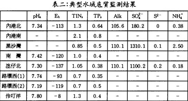 表中,pHs-底質孔隙水pH値,Eh-底質氧化還原電位,單位爲毫伏,TINs-底底質中總無機氮,TPs-底質總磷,Alk-碱度,S