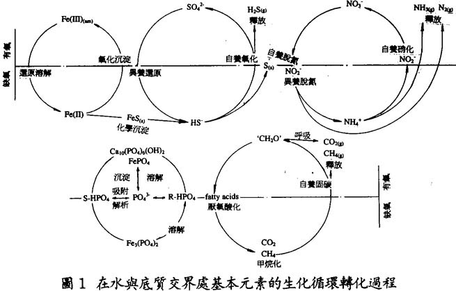 河口水體中的微生物,眞菌,原生質及浮游植物的生物化學合成構成了水體的初級生產力。它是水體生態平衡的標誌,也是生態系統中食物鏈的基礎環節。它是由碳、氧、氮、磷、硫、鐵等基本元素在微生物作用下發生的氧化還原反應完成的,同時伴有吸附解析、溶解沉淀等其它化學反應過程。由於細胞合成的碳源和能源的不同,又劃分爲光合自養合成過程(例如浮游植物的合成)、化學能異養合成(例如眞菌和原生質的合成)等多種循環過程。這些過程相互關連表現出嚴格的有序性。這一點在水與底質交界處表現得尤其明顯。圖一給出在交界處主要元素的生化循環過程及它們的相互關連。表三則給出涉及生化循環的主要氧化還原反應及其反應自由能序列。