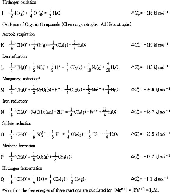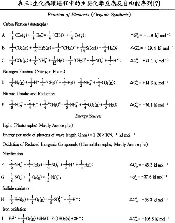表中的自由能値代表了相應的微生物細胞合成所需要能量的最低値或反應能釋放的能量的最高値。正是這一自由能級的序列決定了這些生化反應的先後次序及生化循環的有序性。