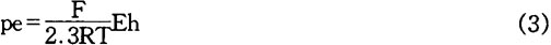 〕和〔H+〕爲這些化學物質的摩爾濃度。pe爲電子活度負對數,它與氧化還原電位有如下關係: