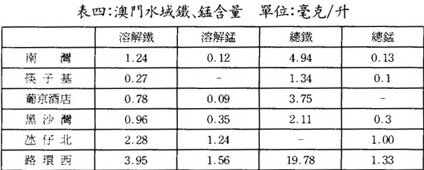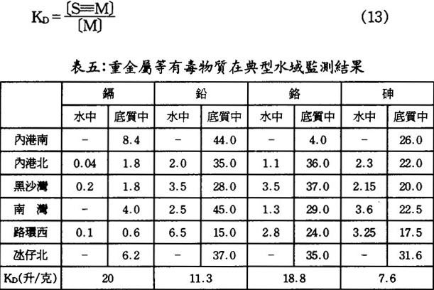 M〕代表重金屬M在沉淀底質中的濃度,單位爲每克毫克,〔M〕爲重金屬在水中濃度,單位爲每升毫克。表五中的數據具有以下單位:在水中重金屬或毒性物質砷的濃度單位爲每升微克,在底質中的單位爲每公斤毫克。表五中也列出了重金屬鎘、鉛、鉻以及砷的分配常數値。它們在8至20之間,說明了澳門水域底質中已發生了重金屬以及砷的積聚。