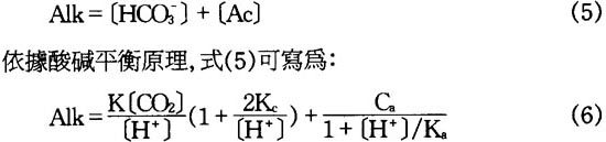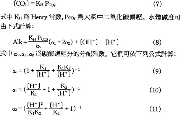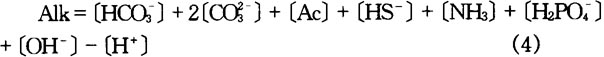 缺氧酸化的底質其孔隙水pHs値除有機酸外還受水的碱度(Alk)及其它酸碱物質例如氨、磷酸、硫化氫等控制〔9〕。水的碱度可由下式計算: