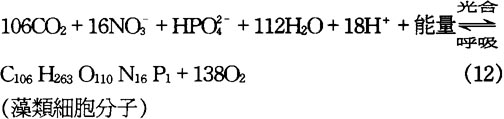 上層水體的生化循環過程與水與底質交界處不同,交界處發生的生化反應(反應L至O)是以化學能作爲細胞合成的能源,而上層水體由於直接受到太陽能的幅射,細胞合成可用光能作爲能源,發生光合異養合成反應,產生浮游植物即藻類。這是水體生態系統初級生產力的重要方面。這一合成反應可用下式表示: