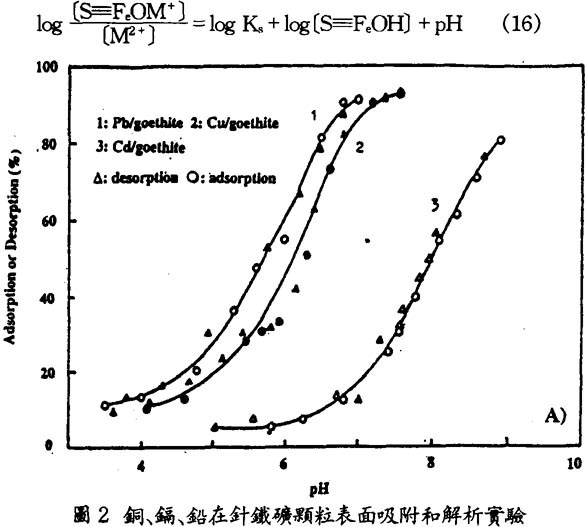 〕代表氧化鐵表面吸附金屬離子M2+的濃度,〔M2+〕爲金屬離子M2+在水中的濃度,Ks爲吸附平衡常數。這一個吸附過程受水的pH値控制,並且是可逆反應。pH値升高即水中氫離子濃度降低時,反應(14)的平衡向右方向移動而發生離子吸附。pH値降低即氫離子濃度升高時反應向左方向移動而發生離子解析〔12〕。圖二給出銅、鎘、鉛離子在氧化鐵顆粒表面吸附和解析實驗結果。圖中△代表隨pH値降低從表面解析下來的金屬離子佔總吸附量的比例,它隨pH 値降低而降低。符號o代表隨pH升高金屬離子吸附百分比,它隨pH升高而增加。可見這一吸附反應是可逆的,受pH値控制。而且吸附和解析都發生在一很狹窄的pH範圍,如對鉛來講發生在6至8之間,而鎘則是4至6之間。在這一特定pH値範圍,pH稍微升高將引起吸附量的突然增加,而稍許降低則引起顯著解析發生。將式(15)寫成對數形式:
