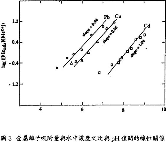 可見吸附的量與水中金屬離子濃度之比與pH成線性關係,在對數座標圖上應爲一直線,且直線的斜率應爲1。將圖二數據進行這樣的處理得到圖三。可見實驗値確實給出了直線關係,斜率在0.94 至1.0之間,證明了上述理論分析是正確的。式(16)左邊恰恰是分配系數KD的對數,而右邊頭兩項爲常數。所以式(16)可改寫爲更實用的形成即:
