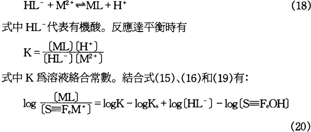 在底質與水交界處有機物異養降解產生的有機酸不僅因降低了孔隙水pH値而引起重金屬解析,而且有機酸本身也可直接使吸附的重金屬解析出來。這是因爲有機酸與重金屬有很強的溶液絡合作用,可以與已吸附在顆粒表面的重金屬離子發生絡合反應生成溶液絡合物,從而將其帶入水中。這一過程機理也可以應用上述表面絡合化學原理來解釋。有機酸與金屬發生溶液絡合反應可寫爲: