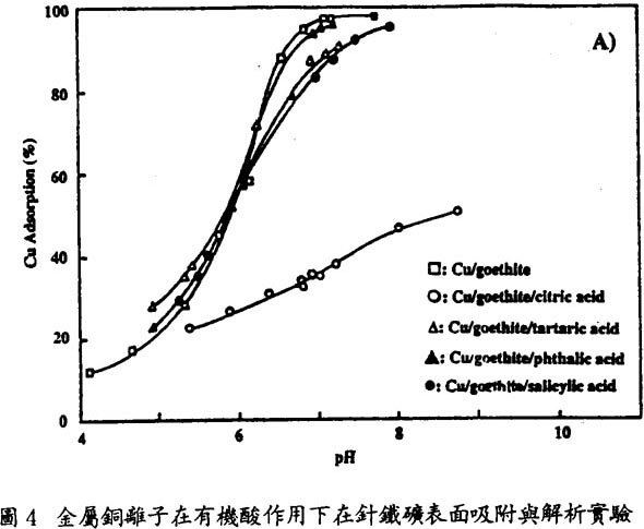 可見,金屬離子溶液絡合與表面絡合(吸附)之比與溶液絡合常數K與表面絡合常數(即吸附常數)Ks之比呈正比關係,即溶液絡合常數越高形成溶液絡合物ML的趨勢越強烈,從顆粒表面解析出來的重金屬離子越多。圖四爲重金屬銅在有機酸作用下從針鐵礦顆粒表面解析出來的實驗結果。所涉及的有機酸有檸檬酸(citric)、酒石酸(tartaric)、水楊酸(salicylic)和苯二酸(phthalic)。由實驗結果可見,與無有機酸的情况比較,在有機酸存在時吸附百分比降低即解析發生。而且,檸檬酸的解析作用最明顯,且有檸檬酸的作用大於酒石酸,酒石酸的作用大於水楊酸這樣一個規律。這是因爲它們與銅離子發生溶液絡合的絡合常數K不同造成的。事實上,檸檬酸、酒石酸和水楊酸與銅離子的溶液絡合常數分別爲100.8,10-1.14和10-2.24,大小順序與它們的解析作用順序是一致的。硏究還表明,有機酸與金屬離子發生溶液絡合反應的趨勢與有機酸本身的酸性強弱有關。檸檬酸酸性最強表現出更強的溶液絡合趨勢,因而解析作用最強烈。