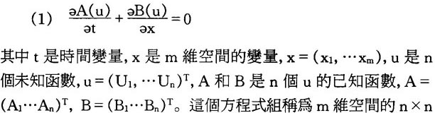 F=(f1……fn)的守恆律組。守恆律組(4)比(1)簡單,但實質性困難完全相同。歷史上首先硏究的是“非線性嚴格雙曲守恆律組”(Nonlinear strictly hypebolic conservation Laws),它的含義是這樣:我們(4)將形式地寫成