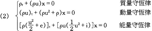 其中ρ是密度,u是速度,是壓強,是比熵,i是比焓、X是歐基里得空間變量,t是時間變量。採用這種時間-空間變量稱爲在Euler坐標下的守恆律組。在氣流中由上述三個基本守恆律組成的方程組稱爲理想氣體動力學方程組,其中ρ、u、e是未知函數,p、i是ρ、u、e的已知函數,它們由氣體的性質確定。所謂“理想”氣體表示粘性系數,熱傳導系數等很小,可以忽略。當x表示質量,t是時間變量,這種坐標稱爲Lagrange坐標。在Lagrange坐標下的質量守恆律形狀特別簡單,這時,