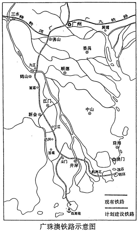 澳門位於珠江口伶仃洋西岸,它曾是東西文化交流的重要樞紐。早在十六、七世紀,澳門便有通往亞歐美三大洲的航線,成爲當時國際貿易的中繼港和互埠市,在國際貿易史上有重要地位。十九世紀中葉,葡萄牙政府宣布澳門爲自由港,企圖維持其國際貿易港埠的地位。可是由於近代香港的崛起,澳門的國際貿易中心的地位爲香港所取代,究其原因:一是鴉片戰爭後,英國佔領香港,以及廣州、上海、天津、漢口等卅多個沿海沿江通商口岸的開放,澳門港口水淺,不能適應近代輪船噸位日益增大航深不斷增加的要求,對外貿易一厥不振;另一是沒有與中國大陸廣大腹地聯網的鐵路,外貿口岸與自由港的優勢未能發揮,經濟的發展受到制約。興建廣(州)澳鐵路的動議已久,早在淸光緒年間,淸政府同葡萄牙便簽訂了“中葡廣澳鐵路合同”,後因英國搶先修建廣(州)九(龍)鐵路而中止。近年由於珠海特區經濟的快速發展,修建廣珠鐵路並延伸到澳門又提上議事日程。經過幾年來的勘測選線和經濟技術論証,該線鐵路興建已通過了可行性評審。1993年中國國務院批准廣珠段鐵路立項,1994年廣東省政府將廣珠路列入該省重點建設計劃,目前正籌備施工。澳門政府亦計劃將廣珠鐵路延伸到澳門。