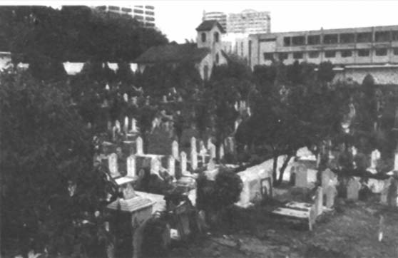 由于地势关系,填场像梯级似的分成高低两层,四边建有骨殖库,中有小教堂,建筑别致,作为葬礼弥撒之用。