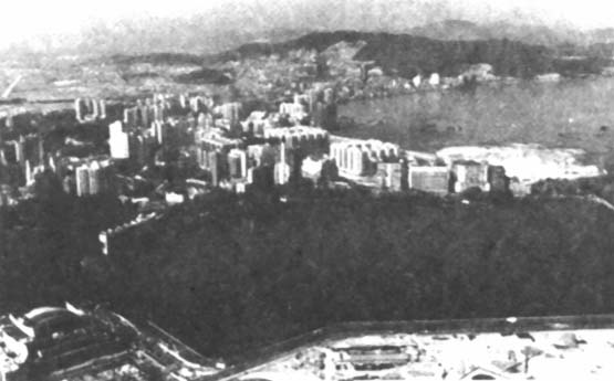 从海角游云俯瞰新口岸,大水塘好像一个人工湖,绿波粼粼,点缀风光;也好像一面大镜,反映蓝天白云,极富自然野趣。然而,这是贮水塘,供应本澳食用水,自来水公司为保持水质清洁,严禁人们涉足水塘。