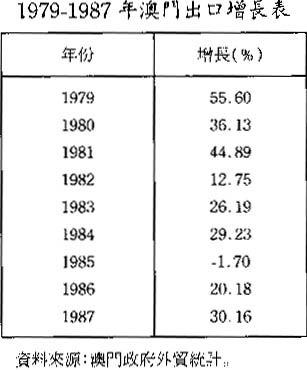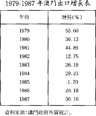 六十年代以來,澳門工業有了較大的發展。統計數字顯示,從六十年代到八十年代,澳門產品出口的平均遞增率爲:六十年代——16.09%,七十年代——24.46%,八十年代——20.68%。