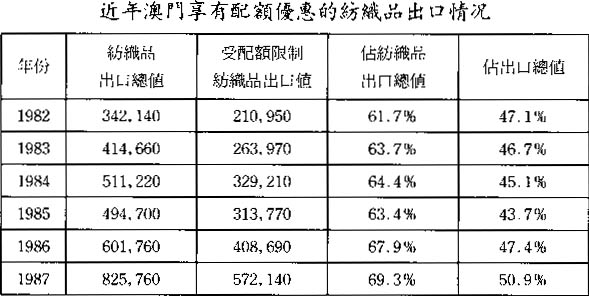 據澳門政府的統計資料,1982年澳門享有配額優惠的紡織品出口値爲21.10億澳門元,佔當年紡織品出口總値的61.70%,佔當年出口總値的47.10%(見附表)。