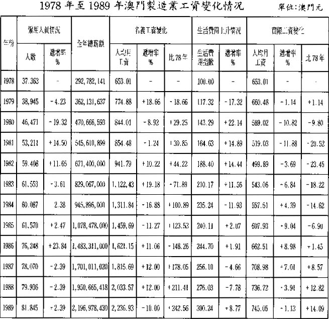 根據附表所示,1978至1983年的五年之間,澳門製造業僱員人數的遞增率爲10.5%,而1983年至1989年的六年之間,製造業僱員人數下降至4.86%。和勞力供應情况相適應的是,本澳製造業工人的實際工資收入(扣除通貨膨脹因素)也有所變化,1978年至1982年期間,由於勞動人口大量增加,本澳工人的實際工資收入除1979年微增1.40%以外,1980—19982年是連續下跌的,83、84年兩年開始有所回升,分別上升了6.84%和4.39%,但由於前幾年跌幅太大,84年的工資水平仍要比78年實際下降14.62%。由於84年以後本澳輸入的內地移民大減,引致勞力價格上升,1985—1987年連續三年本澳製造業勞動工資保持較高的升幅,分別爲9.04%、8.98%和7.01%。和1978年的工資水平相比,1985年本澳勞動力的實際價格仍比78年低6.9%,1985年才剛超過78年的水平,微增1.45%。