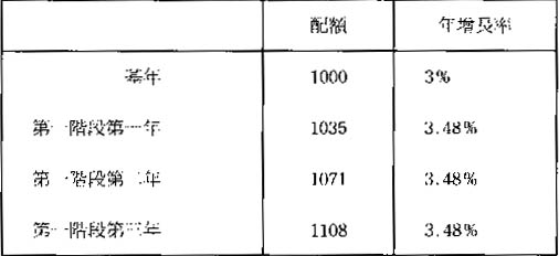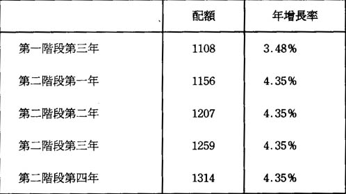 第三階段爲期三年,在這階段的年增長率是根據第二階段的年增長率向上調整27%爲準,而這三年每年的增長率也就按這個增長率來計算,例如在第二階段最後一年的配額爲1314個單位,增長率爲4.35%,而進入了第三階段的第一年後,應由增長率4.35%增加27%而達到5.52%,因而當年的配額也因應由1314個單位增加到1387個單位,而第二,三年的配額也以5.25%的年增長率增長。