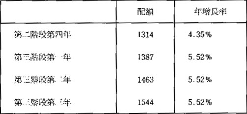 第二階段爲期四年,在這階段的年增長率是根據第一階段的年增長率向上調整25%爲準,而這四年的年增長率也就是按這個增長率來計算,例如在第一階段最後一年的配額爲1108個單位,增長率爲3.48%,而進入了第二階段的第一年後,應由增長率3.48%增加25%而達到4.35%,因而當年配額也因應由1108個單位增加到1156個單位,而第二、三、四年的配額也以4.35%的年增長率增長。