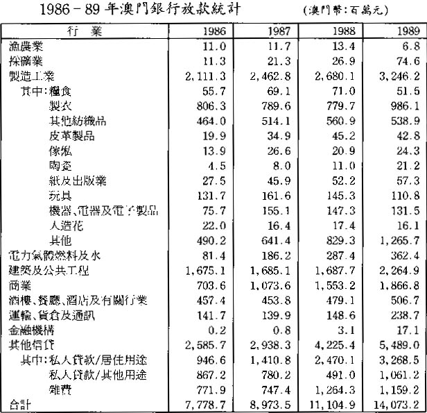 B.近年來,銀行對工業的貸款比重逐漸下降(附表)。創業基金的成立,將與本澳銀行產生一定程度競爭。銀行可能會考慮加強其工業貸款部門,搜集更多工業資料,加聘專業人才,正確評估工業風險,增加工業貸款。另一方面,透過創業基金的協助,商號的資產、資本、管理和債務處理都會較完善,銀行考慮借貸的機會大增。