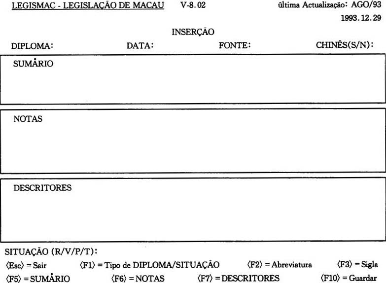 (2)由於該系統文獻檔所建立的只是屬摘要性規格(即是只能輸入憲報中的摘要部分(SUMARIO)。爲提高用戶諮詢法律資料庫的效率,可以考慮改善由目前的只輸入摘要部分的狀况,改變成爲全文細節地(即法律全文)輸入資料庫內(15)。