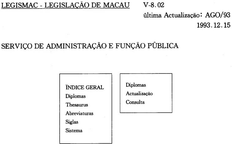 (15)1993年6月29日香港明報刊登了一篇關於澳門政府引進SyBase服務機的文章,其中指出:澳門政府行政曁公職司電腦部主管杜志文稱,當引進新系統後,原有的檔案庫已提升爲電腦服務機/伺服器數據庫管理系統,另各政府部門之工作人員將可按需要,而從桌面電腦提取所需法律文件的簡要及全文,而文件更備有葡文及中文版本可供選擇。這一則消息證實政府也正在全力推廣電腦化及行政現代化,只是待正式的早日落實這一計劃。