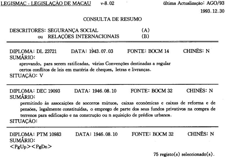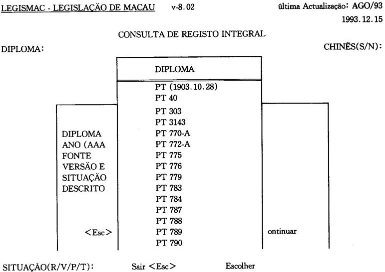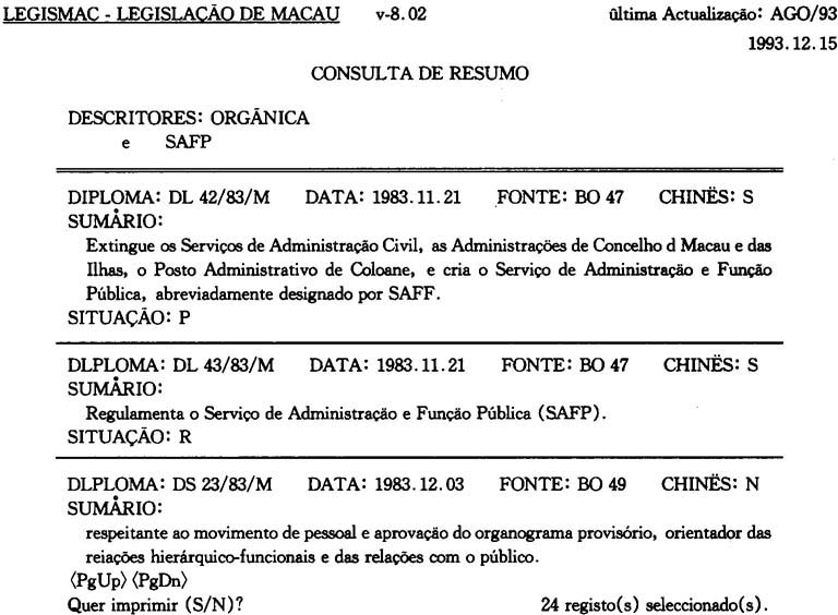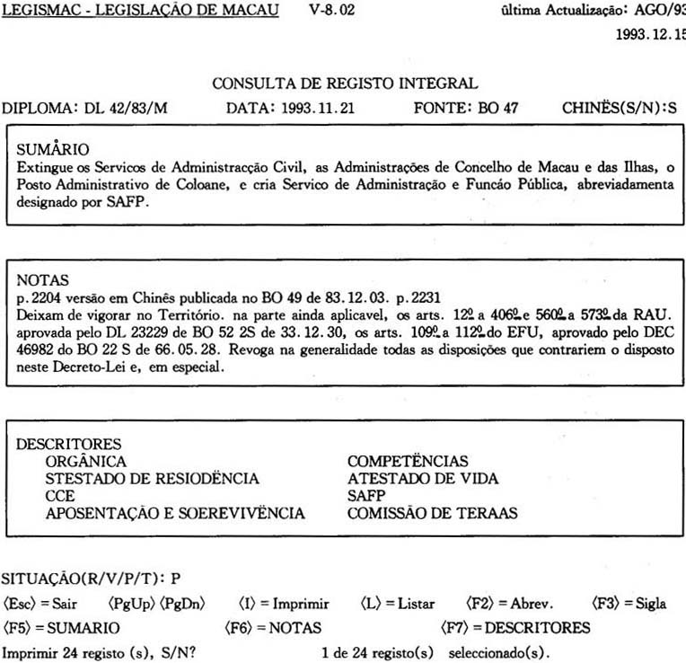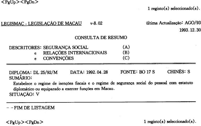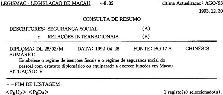 至一九九三年年底爲止,LEGISMAC的葡文叙述詞表共收錄了法律、政治、財經、文化、敎育、科學等方面的叙述詞彙共2,461個,且已譯成中文。這様,爲中、葡文雙語版本的LEGISMAC的建立打下了部分基礎,由此,也可預見中葡雙語版本的法律資料庫的出現爲期不遠。但是,我們從另一個角度來看,爲了使更多的學者、硏究生及法律専業工作者使用該系統,從諮詢效率的角度考慮,應盡可能的提供多項選擇性諮詢,以創造更多的條件,讓用戶樂意充分的使用該資料庫。