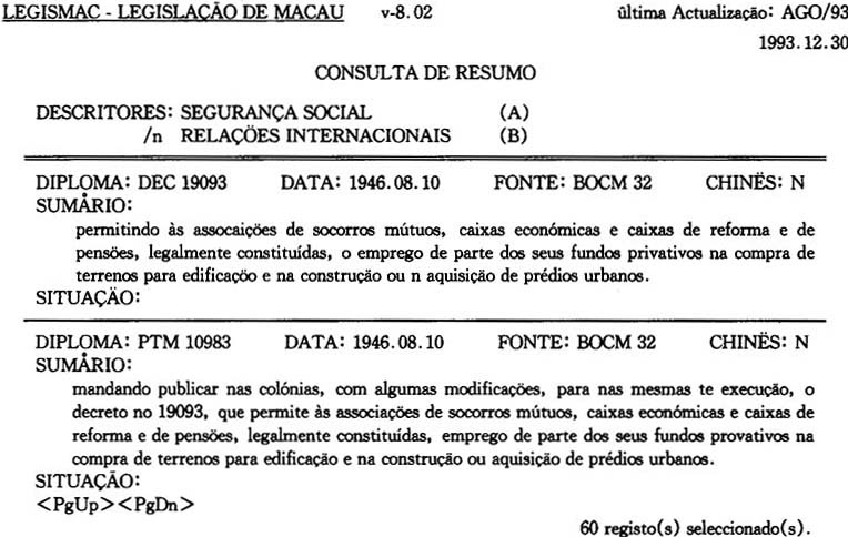 ③OUTROS一詞,在LEGISMAC中是以收集政府機構的有關法律佈告、聲明及民間社團組織的合法登記狀况等。