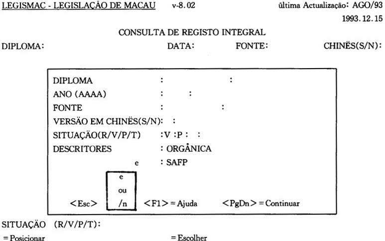 此法是在摘要性或全文性的諮詢視窗內(除了叙述詞一欄)輸入所需要諮詢的具體資料,即可直接檢索到用戶所需的資料。例如:在DIPLOMA(法律)一欄內直接輸入法律文獻的號碼:DL 63/87/M即可。此外,也可以透過其他項目,如年份、來源、是否有中文譯本、法律狀况等直接輸入方法檢索資料,目的是可以提高檢索速度。