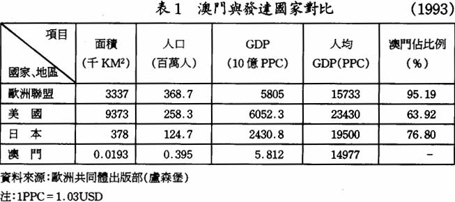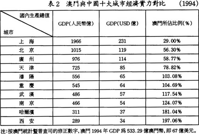 雖然澳門經濟增長自1993年起已連續四年處於下滑狀態,1996 年更出現近三十年來首次負增長(-0.3%),但原有發展成果不可低估。澳門1995年本地生產總値達到594億元(折75億美元),人均GDP爲145,143澳門元(18,219億元),1996年略爲下調到593.36億元(74.5億美元),人均GDP爲142,828澳門元(17,927美元),依然居“四小龍”中位,已經被國際組織列爲世界46個高收入國家、地區行列之中⑤,同時在約佔全球國家、地區總數三分之一的微型經濟中其人均GDP可位列前十名之內。按照歐盟公佈的數字,澳門1993年的發達程度已達到歐盟平均値的95.19%(見表1)並超過芬蘭、愛爾蘭、西班牙、葡萄牙和希臘。澳門經濟實力也超過中國十大中心城市第5名的瀋陽(見表2)。