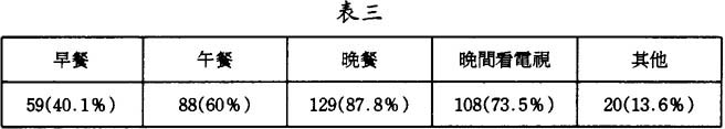 表中顯示,子女和父母見面的場合絕大多數是在晚膳或晚上看電視的時間內。一般電視節目以娛樂爲主,看過娛樂性的電視節目當然可獲得精神鬆馳,即得到心理滿足,但也因精神完全投入電視劇情,而可能令家人雖然一起分享電視節目,而令互相關心時間相對減少,所以父母應該率先控制看電視時間,而將時間放在更有利增進家庭關係的活動上,使家庭成爲靑少年成長的摇籃。