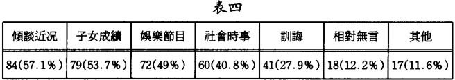 表中顯示,子女和父母的談話內容有五成是關於傾談近况及子女成績,有接近五成是談及娛樂節目,很幸運地,祇有一成多的是兩者相對無言。