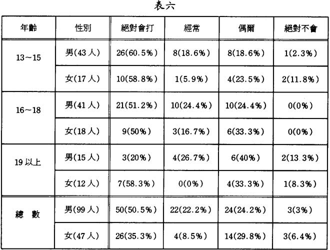 表中顯示,13~18歲的靑少年男女,有超過半數是絕對會主動致電回家告知家人夜歸的,這表明這批靑少年對家庭仍有強烈的歸屬感,仍希望自己的家人關心自己,但是,到了19歲以上的男子組中,祇有五分之一的靑年是肯定會致電,而有百分之二的被訪者是祇會偶爾致電的,這表明這批男子開始感到家庭得不到自己要求的關心,而逐漸脫離原有的家庭,找尋其他的依托。然而,在19歲以上的女子組上,仍有接近六成(58.3%)的被訪者肯定會打電話回家的,這可說明女孩子對家的歸屬感較男孩子的爲大。