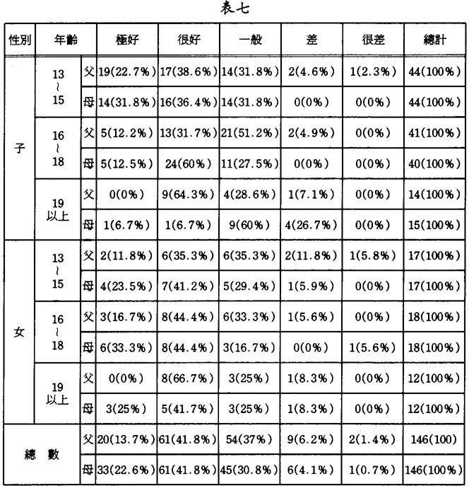 由表中可知,超過六成的被訪者認爲其與父母之關係爲“一般”或“良好”,這表明現今澳門靑少年對家人的感覺仍很好,另外,認爲和母親關係差或很差的,遠較認爲和父親的關係差或很差的少,這也可表明母親和子女的關係較父親的好,然而,男子19歲以上組有超過四分之一(26.7%)的被訪者認爲與母親的關係差,其中原因有待日後探討。而認爲感情屬於一般的有三成以上,眞幸運地現今澳門學生與父母感情不好的祇有百分之五左右。