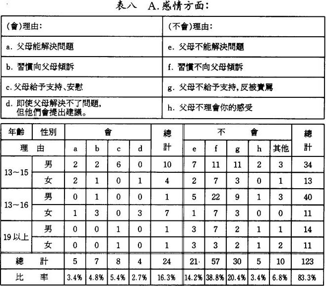 由表中可得知,絕大多數(83.7%)的被訪者是不會把感情困難告訴父母,其原因大都是因爲他們習慣不向父母傾訴,這亦表明雙方對某些問題上仍有所保留。