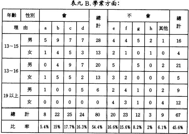 由表中可得知,會向父母傾訴的和不會向父母傾訴的比例差不多,而會的稍多,達54.4%,他們會說的原因和不會說的主要原因比例也相差不遠。但有一點値得留意,就是19嵗以上組,不論男女都不太會向父母傾訴這一方面的困難,這或許是他們認爲父母不能解決問題或習慣不向父母傾訴,其實他們已明白自己的學習態度,但無論如何,這已表明年長的不太希望受到父母的約束。