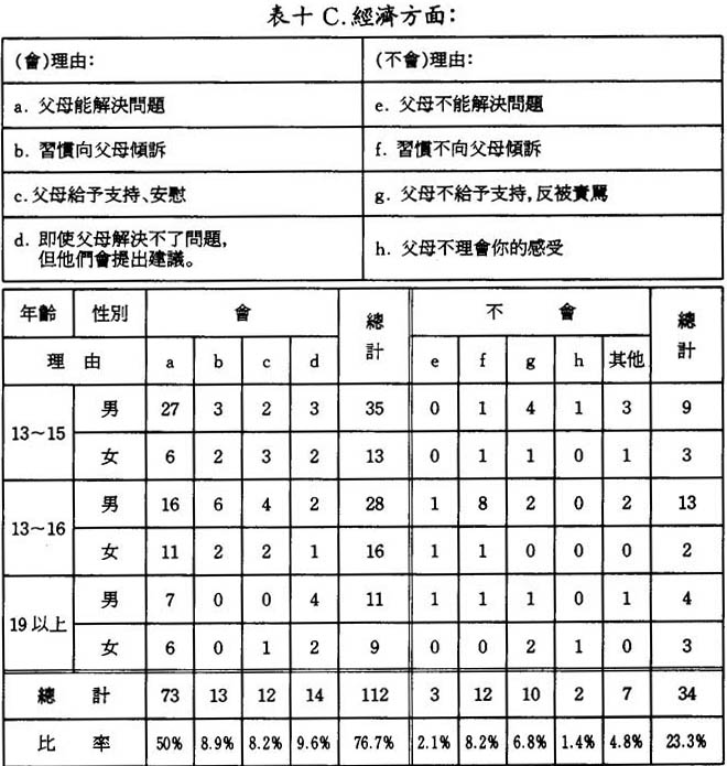 從表中可得知,超過四分之三(76.7%)之被訪者是會和父母傾訴這方面的困難,這可看出靑少年仍需得到父母在經濟上的支助的,而他們亦較多認爲父母能解此問題的。