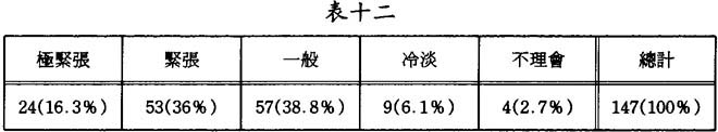 表中顯示超過一半(52.3%)的被訪者感受到其父母對他的學業成績表現得極緊張或緊張,而祇有不到一成(8.8%)之被訪者是認爲父母對其學業表現冷淡或不理會,這說明,父母對子女的學業成績比較着緊。父母期望子女能讀好書,將來工作有出息,就是對父母精神上最大的安慰。