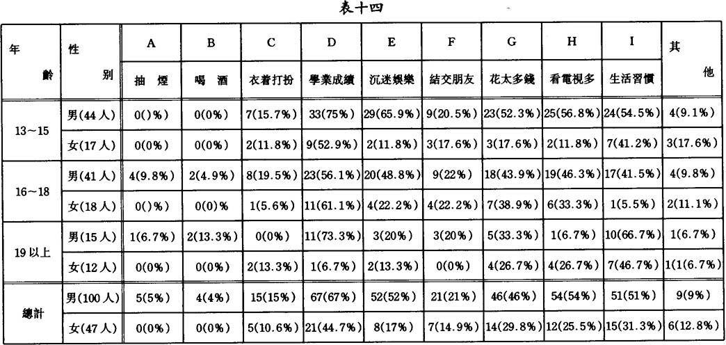 表中顯示,父母對子女的學業成績,花太多錢,看電視太多及生活習慣之批評較多,可以看出如今父母着緊於子女的那幾方面,也可看出子女之生活多於花錢,看電視及生活習慣上出問題。