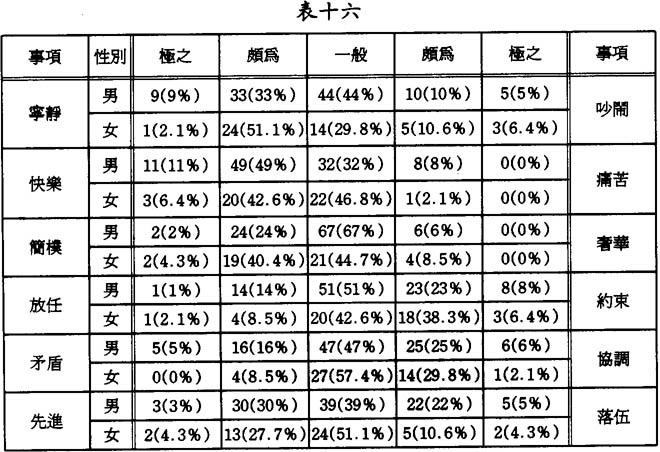 由表中可知,在寜静方面,超過七成半的被訪者認爲其家庭一般或頗爲寧静,少吵鬧,在這種氣氛下,超過八成的被訪者認爲其家庭是快樂的。