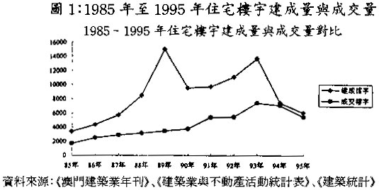本世紀從80年代初至90年代中期,澳門住房市場的樓宇供應經歷了兩個明顯的變化時期。1981年至1984年,由於受到世界經濟衰退的影響,住房市場持續處於低潮。1985年5月,中葡兩國政府就澳門的前途問題談判,宣佈達成協議的利好因素,及鄰近地區(特別是中國的改革開放和香港的經濟起飛)的影響,住房市場漸見興旺,住宅樓宇供應每年上升,至1989年達到高峰,住宅單位供應量從1985年的3396個,到1989年的14946個,期間,平均每年增加約44%。但是,對比成交量(附表7),住宅單位的供應量一直以來都超過了實際需求量。隨着1989年國內政治事件,房屋市場冷卻下來。1991年下半年開始,大量外來資金投向房地產市場,住宅樓宇的供應量迅速上升,出現了第二個高峰期,1993年住宅樓宇的供應量達到13665個,大大脫離了市場需求,再者,由於當時中國實施經濟宏觀調控,內地資金被調回,市場大幅向下調整,1995年住宅樓宇的供應量與1993年相比,已下降了約44%,但仍然超出實際需求量。(圖1)